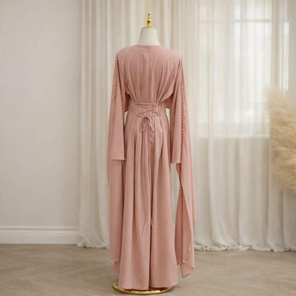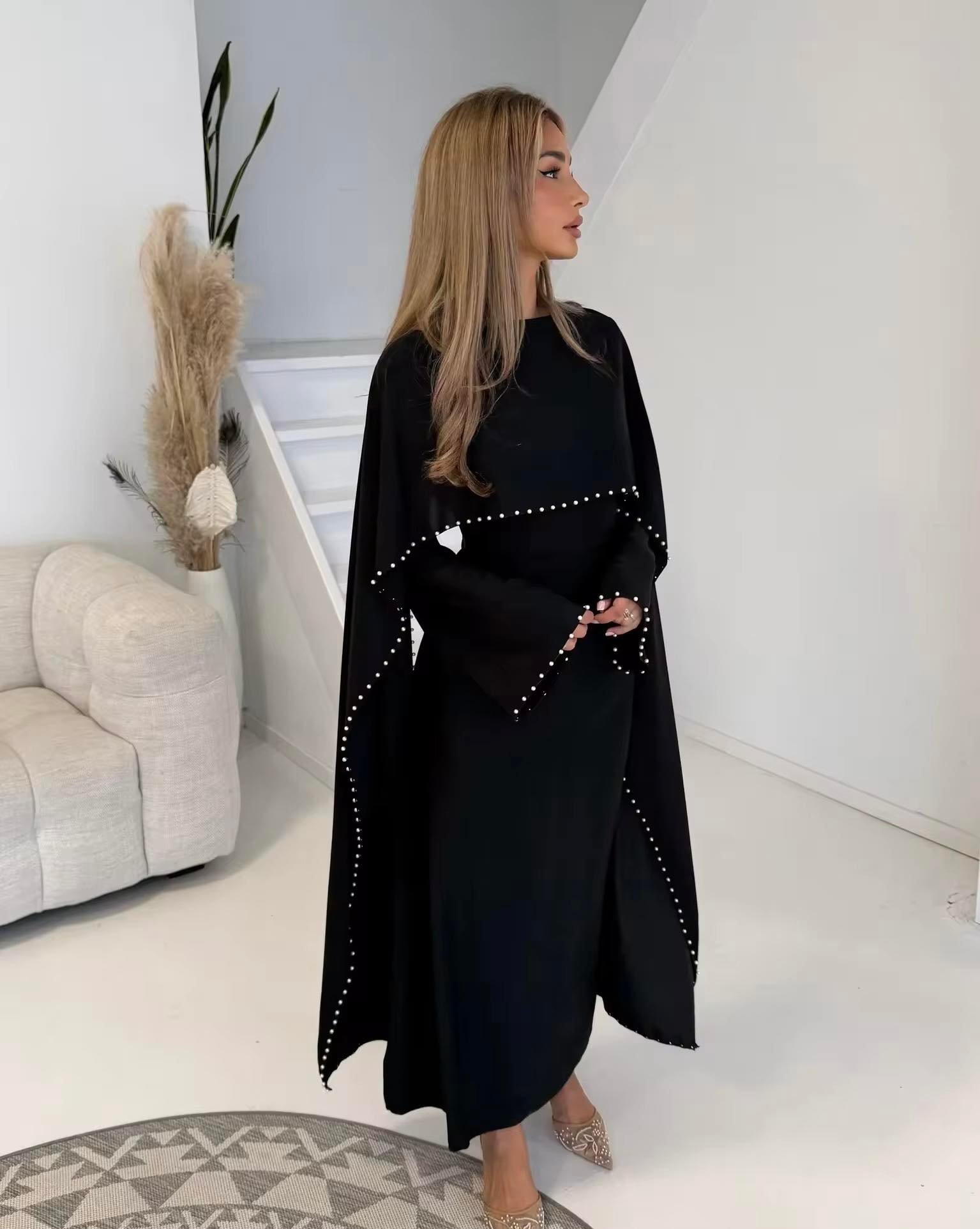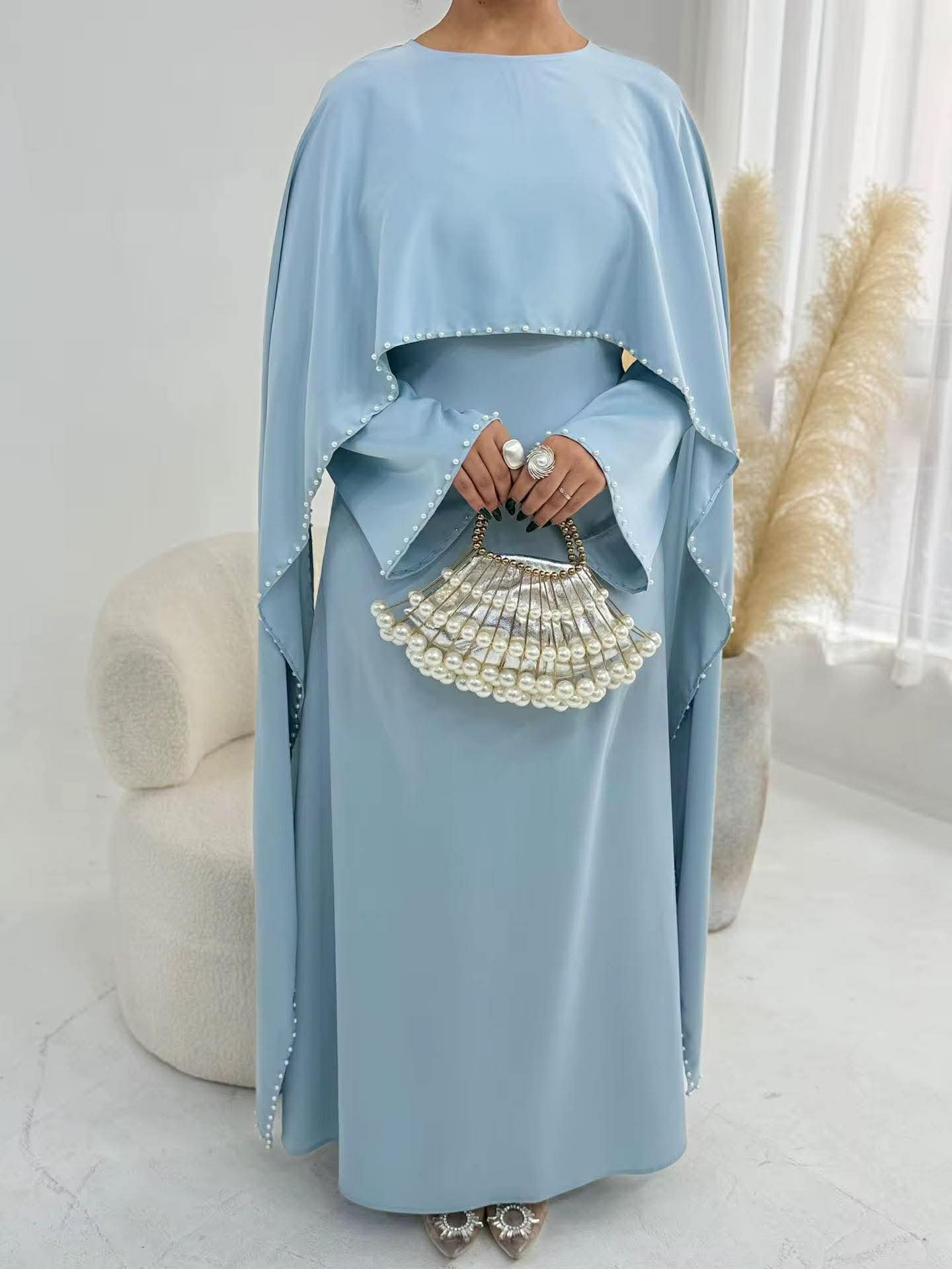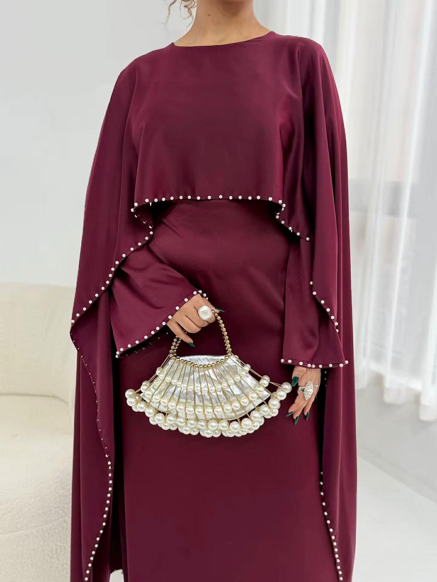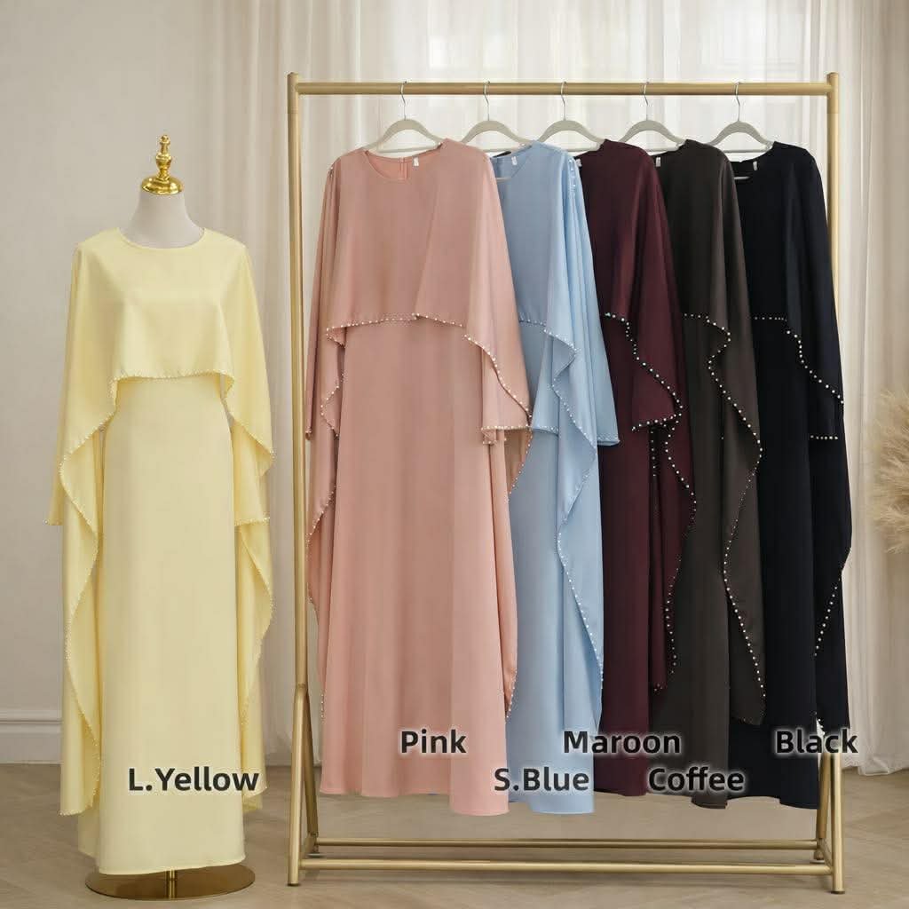 The Cape Pearl Satin Dress is a refined statement piece designed for effortless elegance. Crafted from smooth, flowing satin, this full-length dress features a graceful overlay cape adorned with delicate pearl detailing along the edges. The soft drape enhances movement while maintaining a modest, sophisticated silhouette—perfect for special occasions, evening events, and formal gatherings.