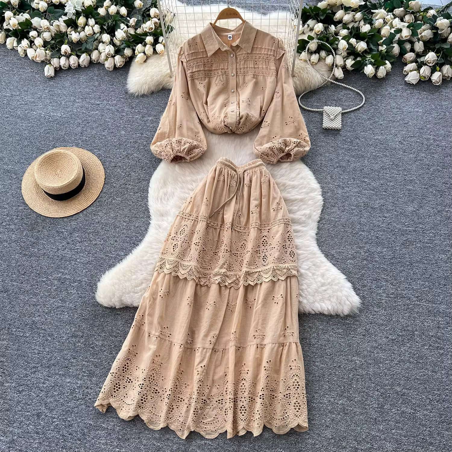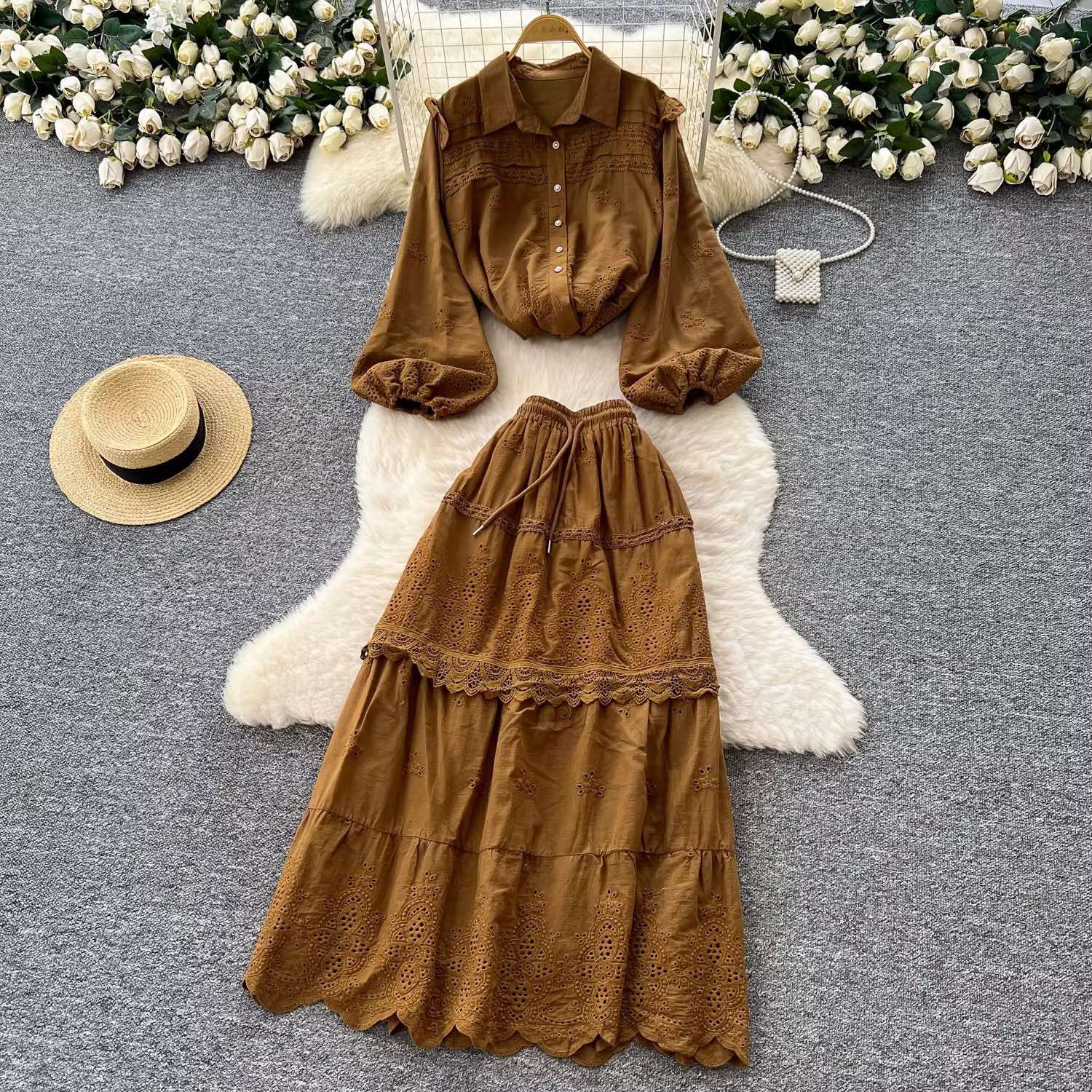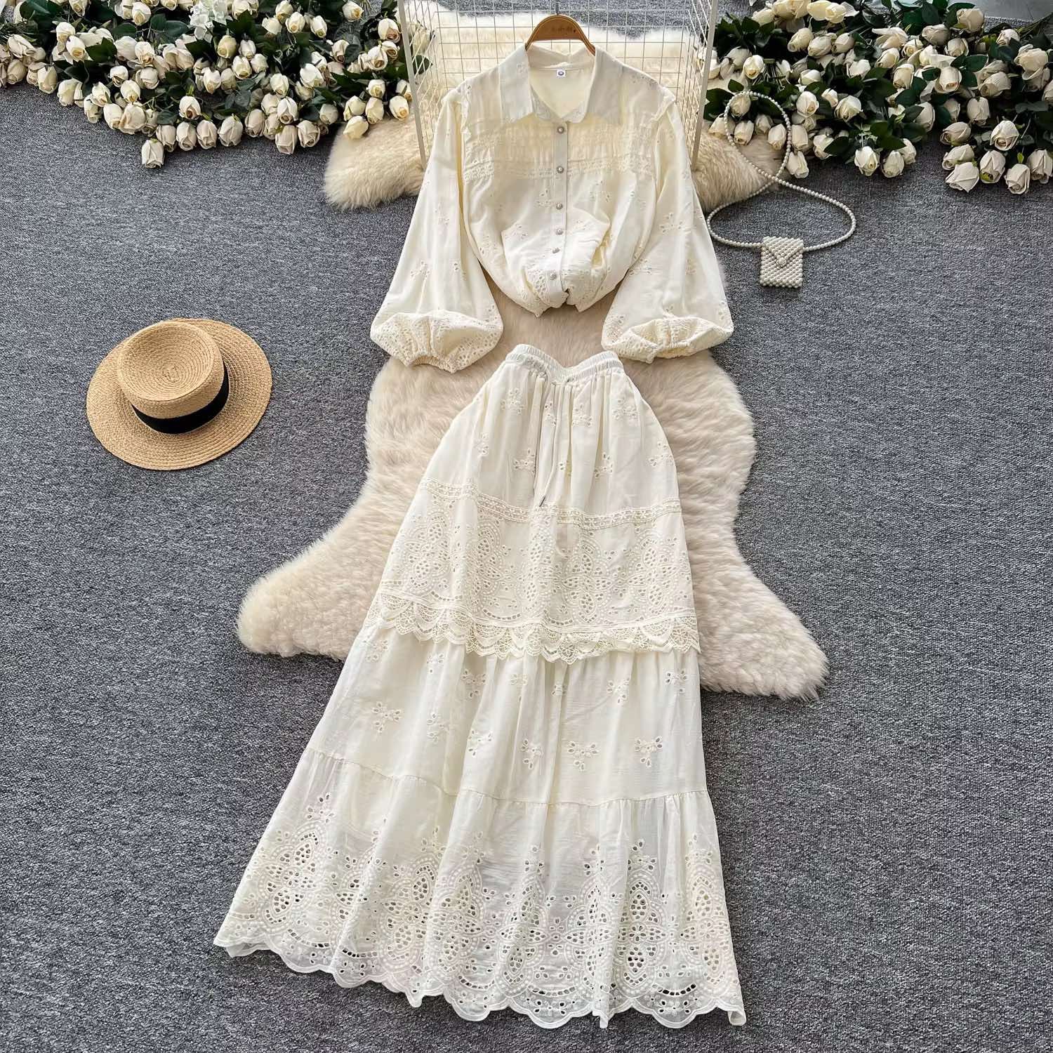 The blouse features a classic button-down design with long sleeves and embroidery accents for a soft feminine touch. Paired with the tiered skirt, finished with intricate eyelet embroidery and scalloped hem, this set creates a graceful, timeless silhouette.