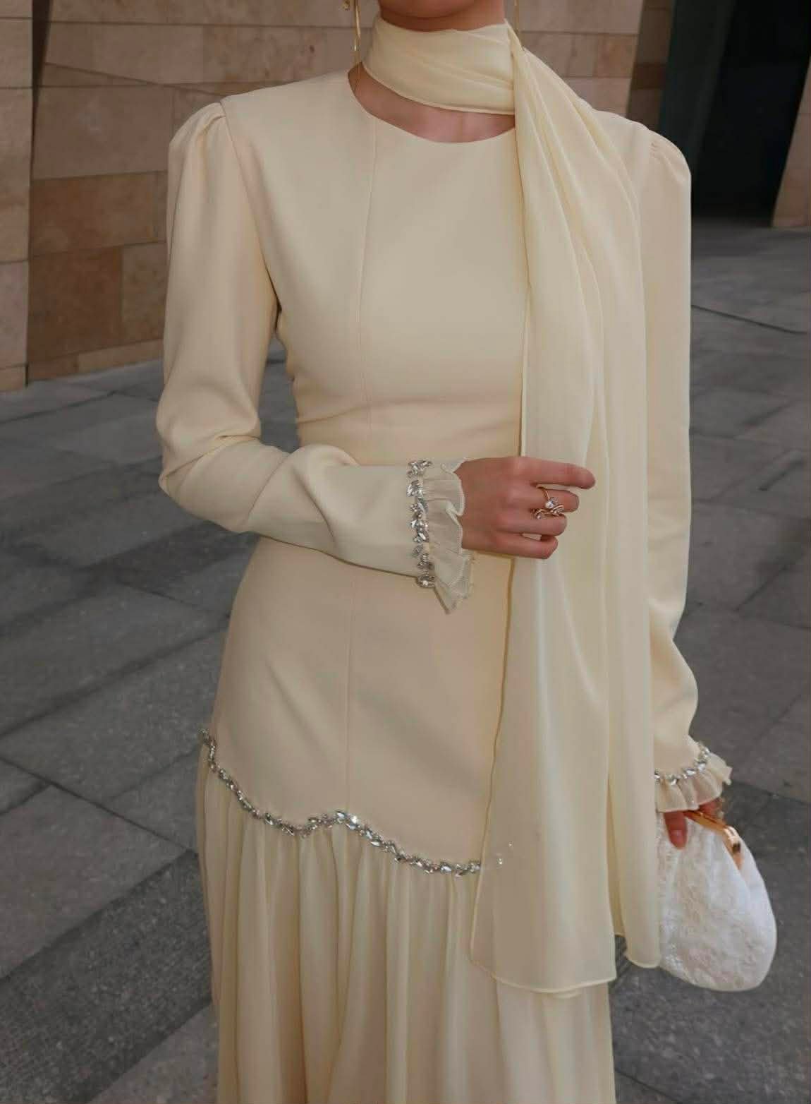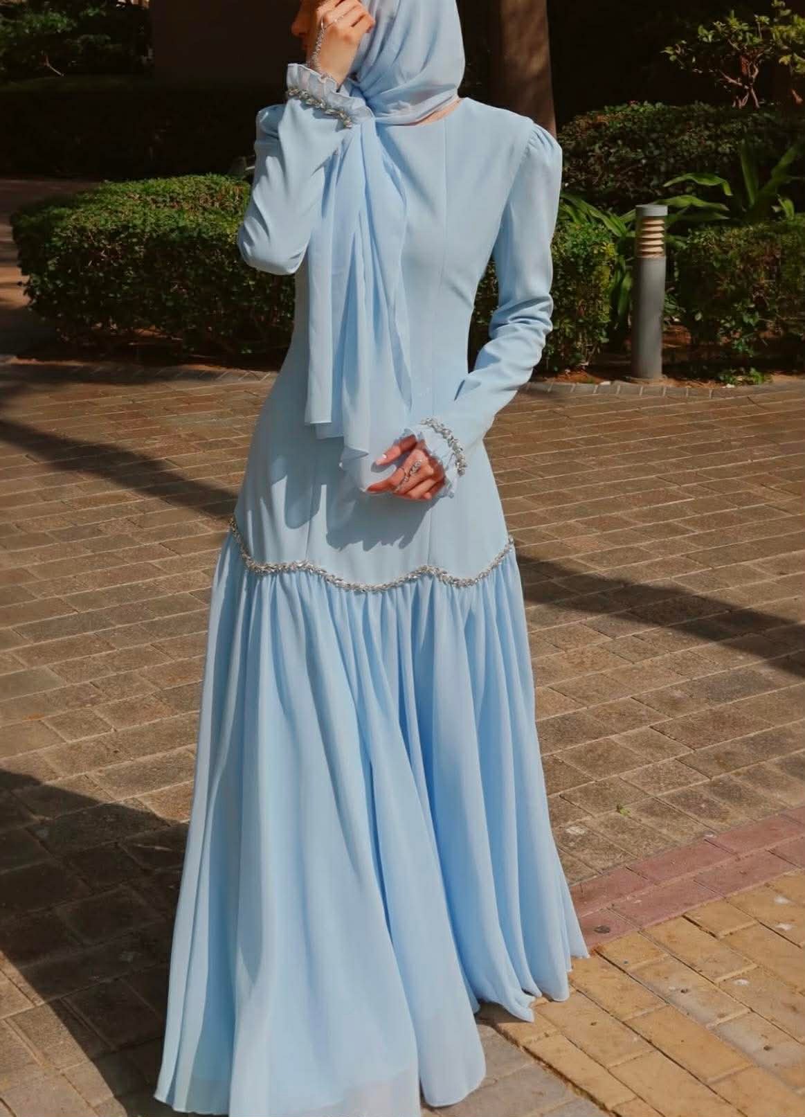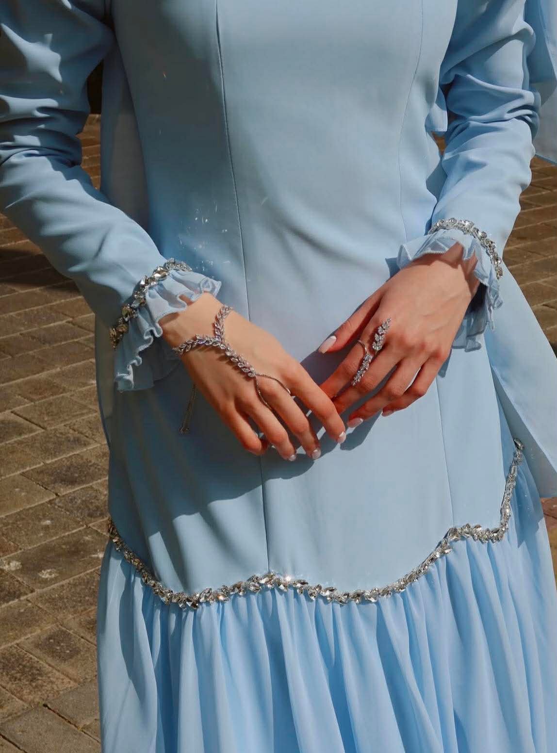Crafted from a blend of viscose and chiffon, this dress offers a soft structured bodice with a beautifully flowing skirt that moves with every step. The silhouette is enhanced with delicate crystal embellishments along the waistline and cuffs, adding just the right touch of sophistication.