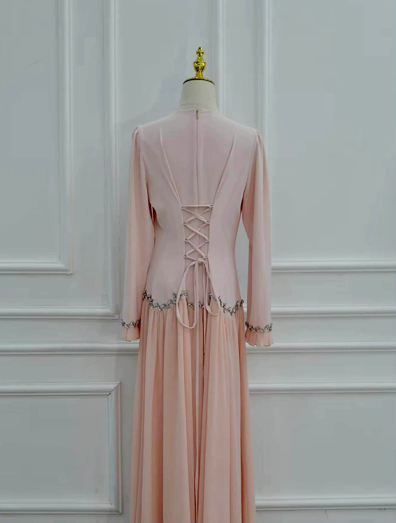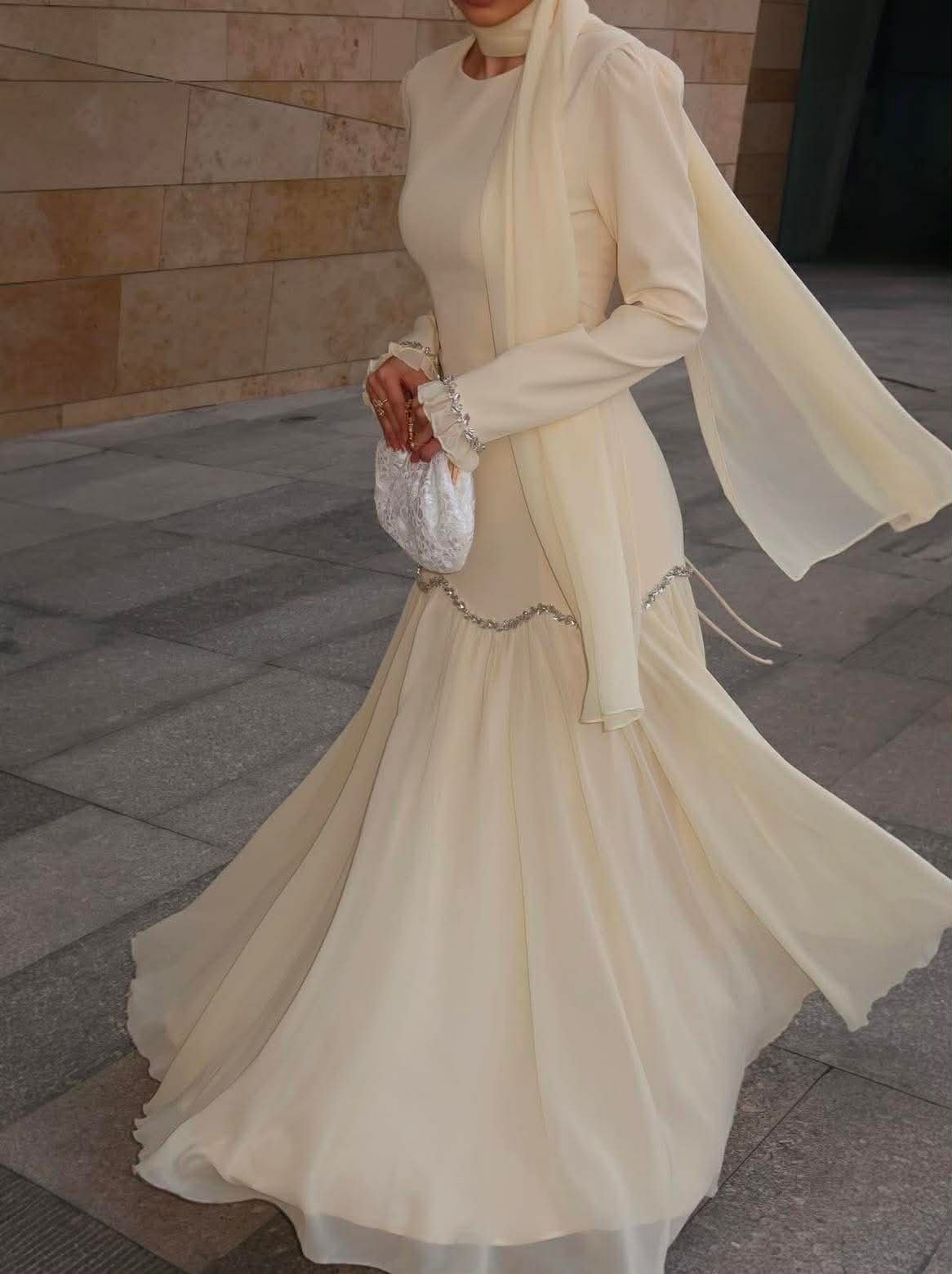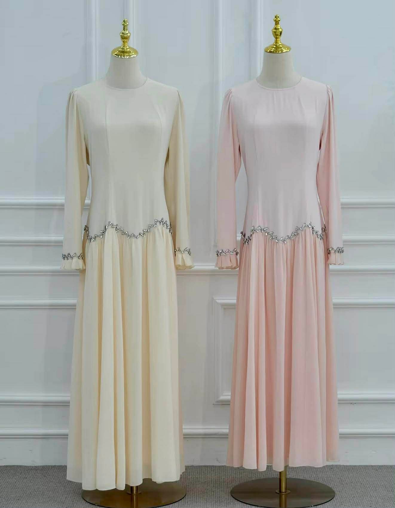 Crafted from a blend of viscose and chiffon, this dress offers a soft structured bodice with a beautifully flowing skirt that moves with every step. The silhouette is enhanced with delicate crystal embellishments along the waistline and cuffs, adding just the right touch of sophistication.