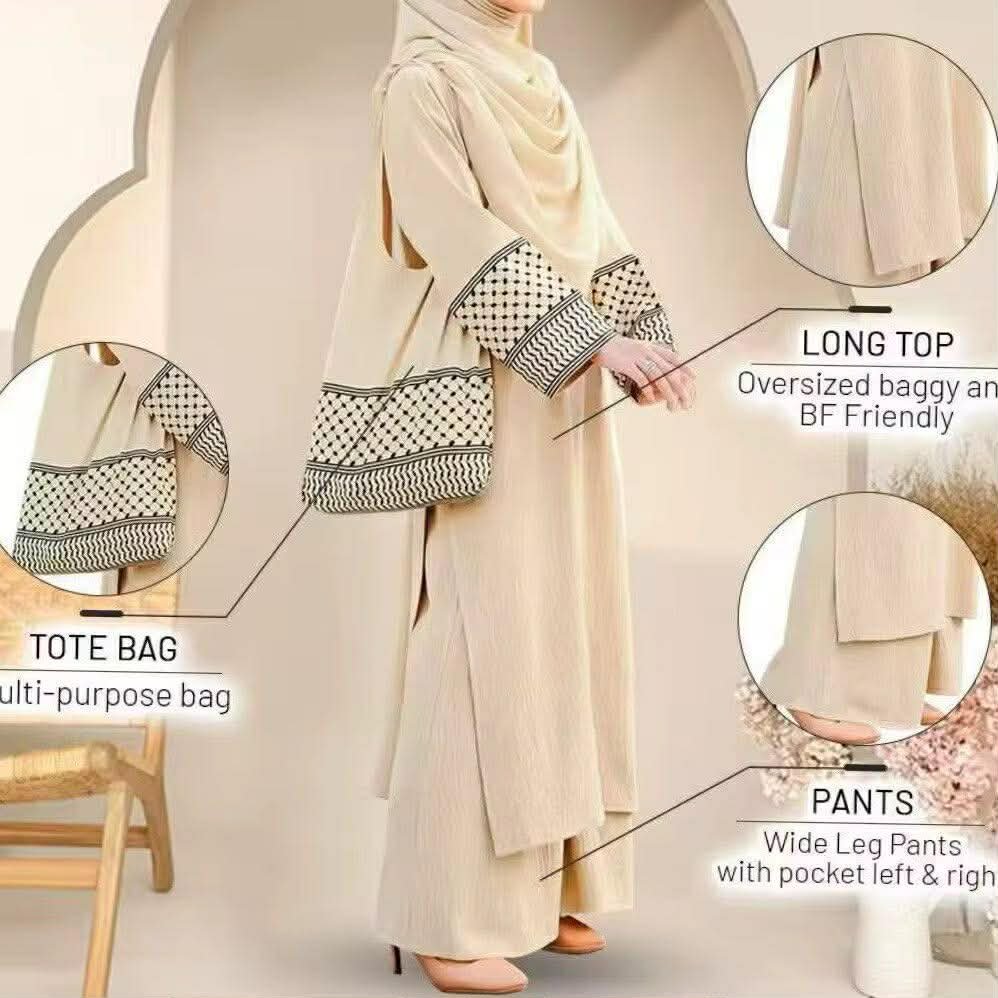 A perfect fusion of modest elegance and contemporary style, the Keffiyeh Elegance Co-ord Set is designed for effortless sophistication. Crafted from lightweight crepe fabric, this set features a flowy long top paired with wide-leg pants, beautifully complemented by subtle keffiyeh-inspired detailing on the sleeves and matching tote bag.