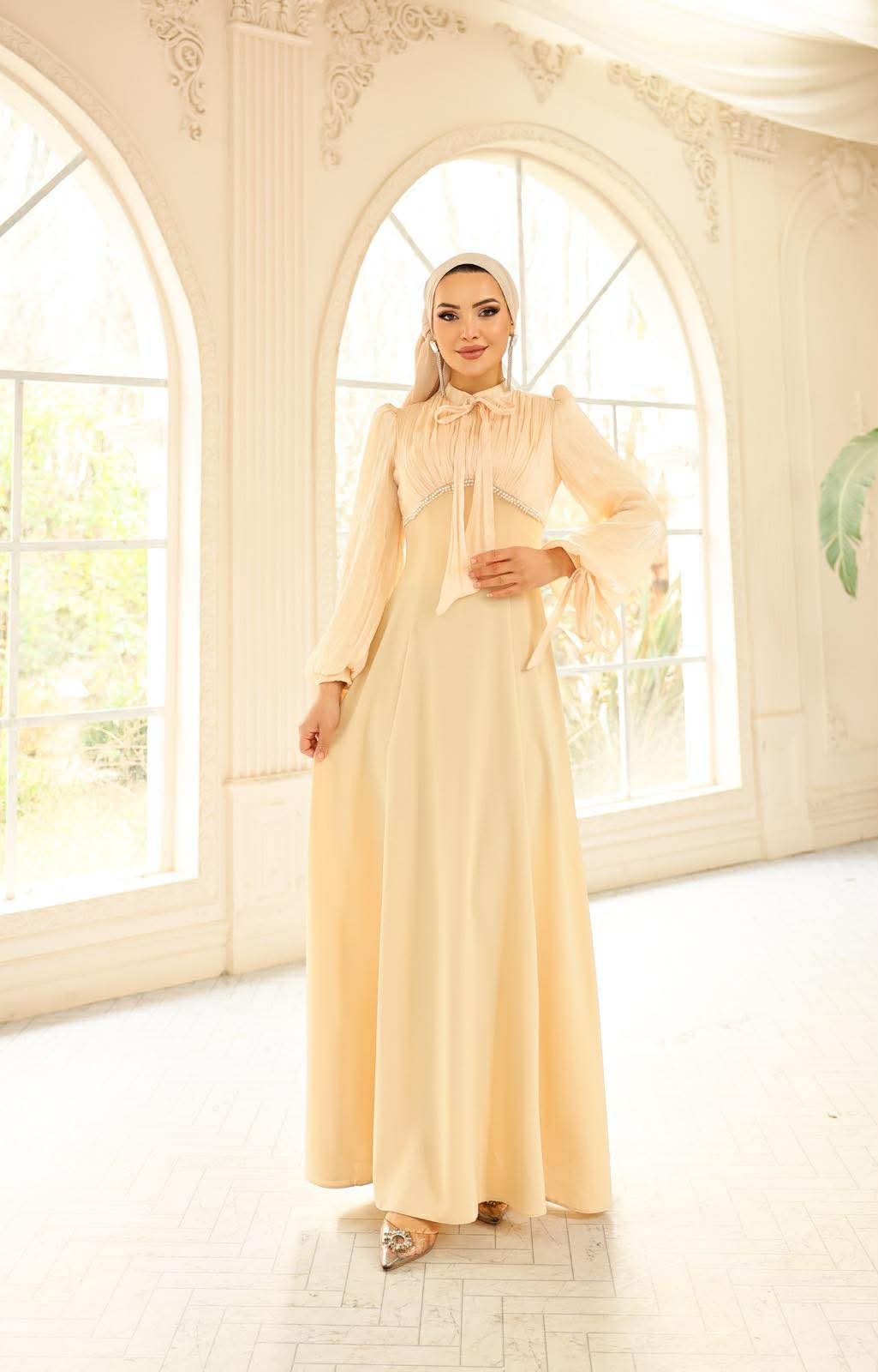 A graceful maxi dress designed with a softly draped chiffon bodice and flowing silhouette. Featuring delicate pearl detailing under the bust and airy balloon sleeves, this piece blends timeless elegance with modern modesty—perfect for special occasions and formal gatherings.