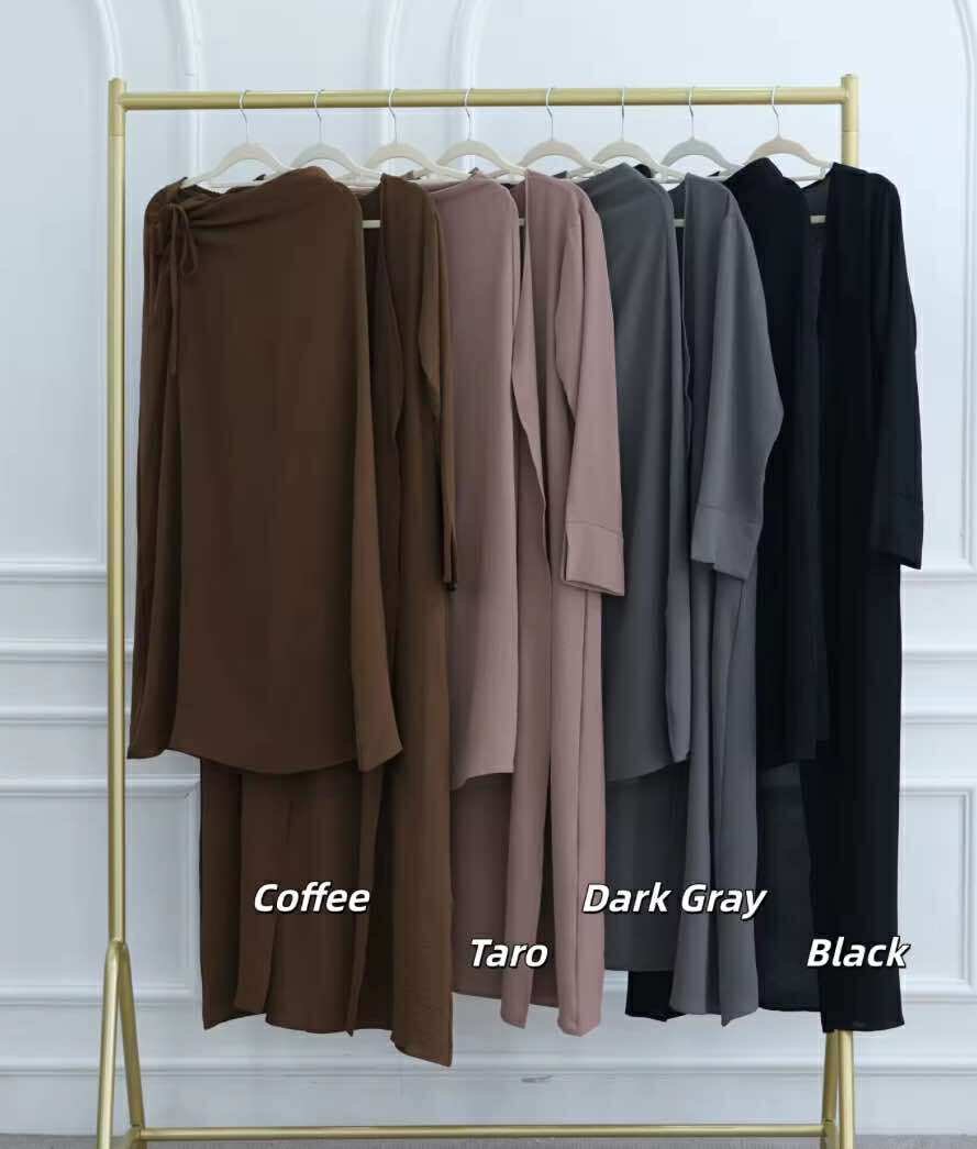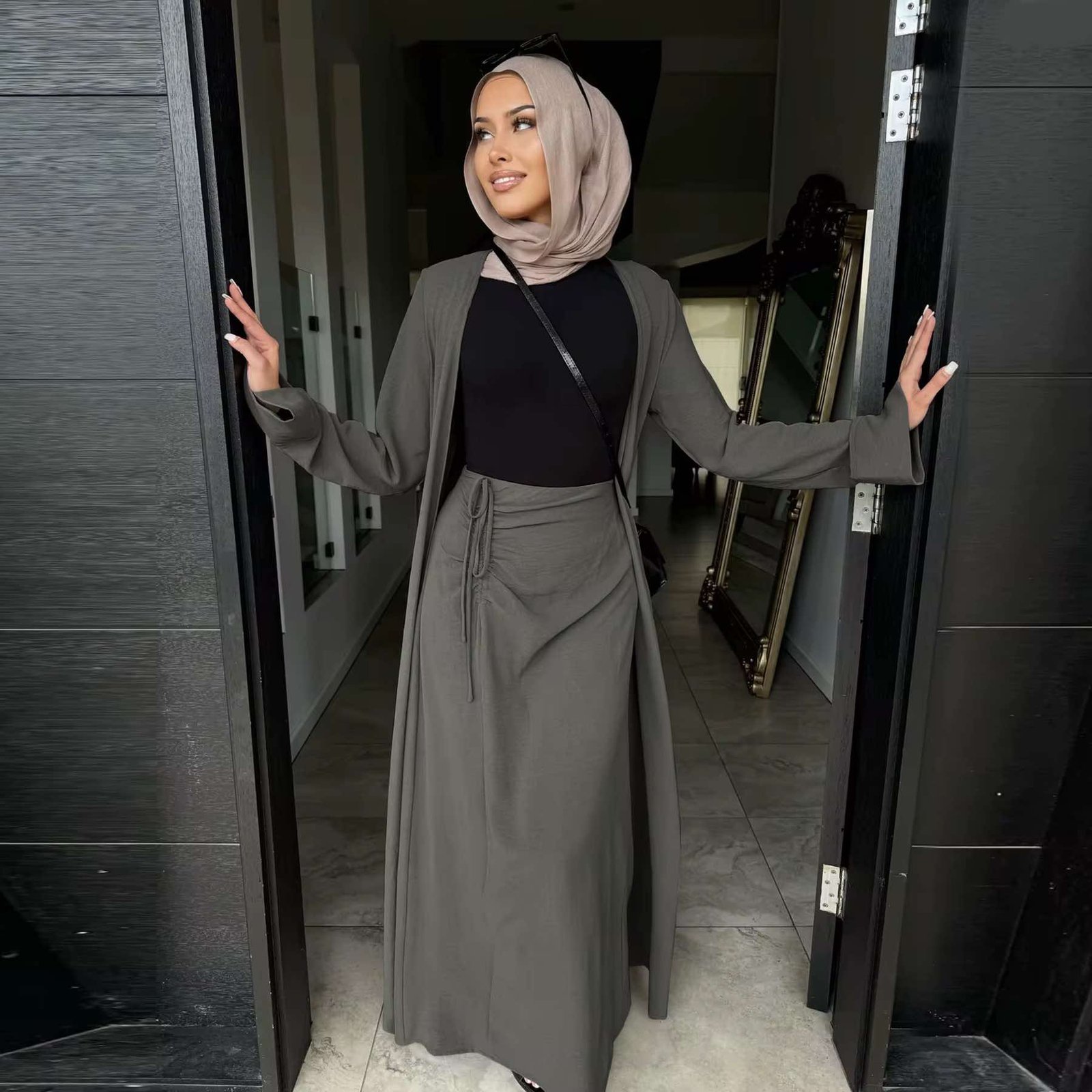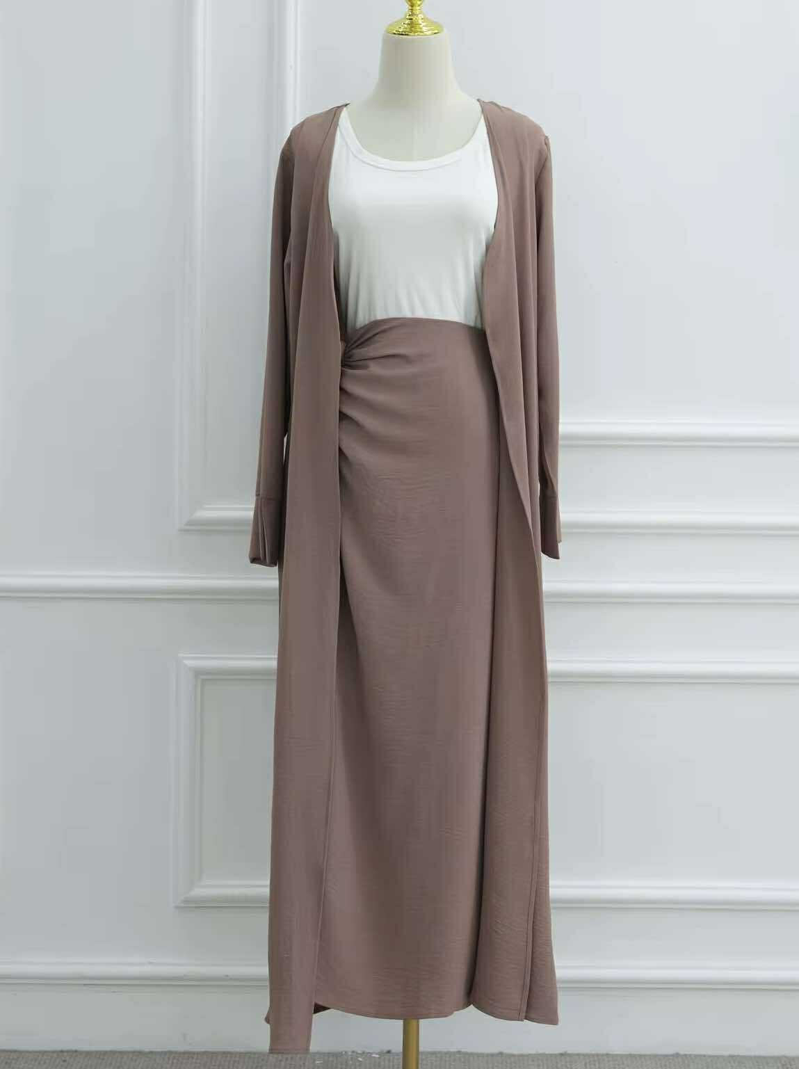 Elevate your modest wardrobe with our Crepe Elegance Two-Piece Set, crafted from soft wrinkle crepe fabric for all-day comfort and flow. This set includes a sleek open abaya paired with a matching maxi skirt, designed with a flattering drape and tie detail at the waist for effortless styling. Perfect for casual chic or layering with your favorite tops.